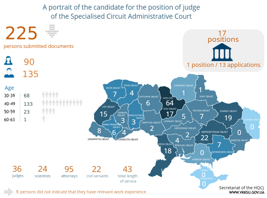 A total of 356 applications were submitted to the High Qualification Commission of Judges of Ukraine for participation in the competitions to fill vacant judicial positions at the Specialised Circuit Administrative Court and the Specialised Administrative Court of Appeal. The number of unique candidates is 268, with 88 candidates applying simultaneously for judicial positions at both the Specialised Circuit Administrative Court and the Specialised Administrative Court of Appeal.