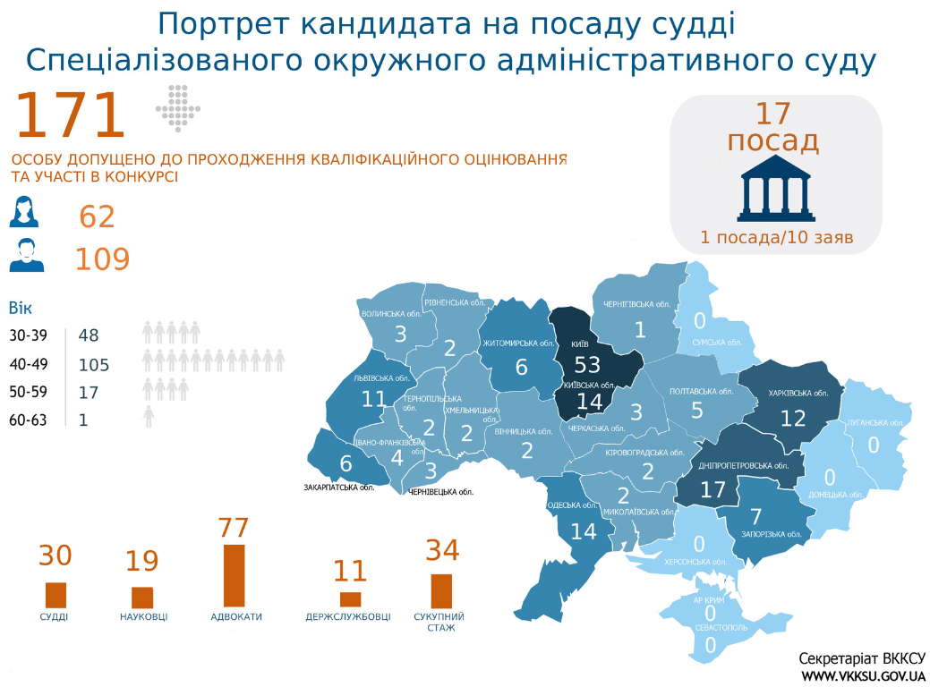 До кваліфікаційного оцінювання та участі в конкурсі на зайняття 17 вакантних посад суддів СОАС допущено 171 особу. Серед кандидатів 109 чоловіків (64%) та 62 жінки (36%). Більшість кандидатів віком від 40 до 49 років – 105 осіб.