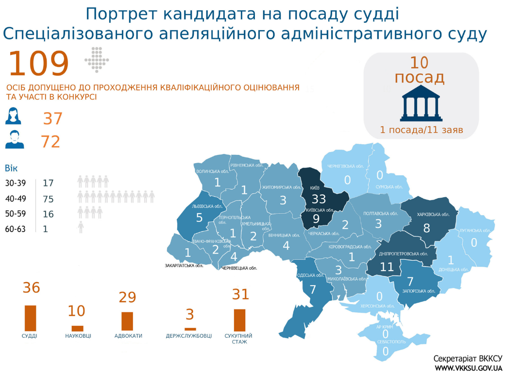 До кваліфікаційного оцінювання та участі в конкурсі на зайняття 10 вакантних посад суддів СААС допущено 109 осіб. Більшість чоловіки – 72 (66%), жінок – 37 (34%). Як і в конкурсі до СОАС, найчисельніша вікова група 40–49 років – 75 кандидатів.