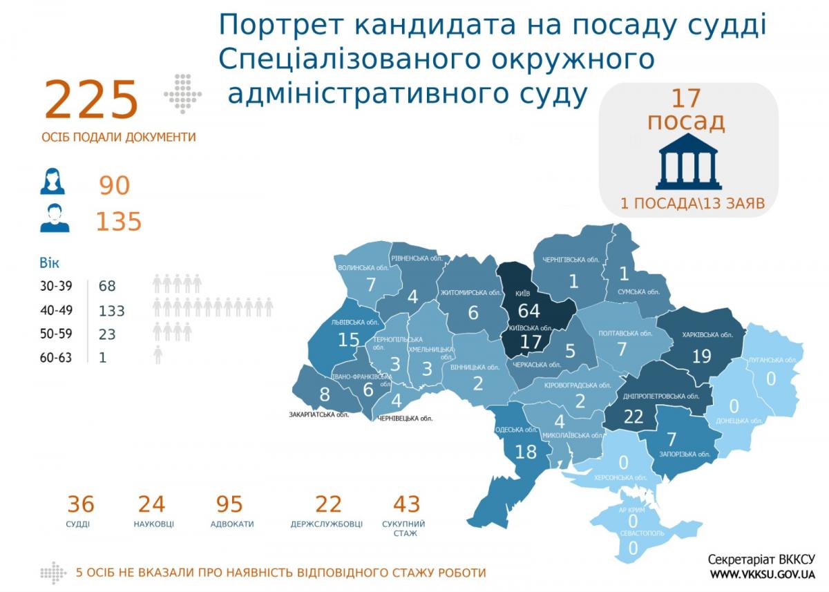 До СОАС на 17 вакантних посад суддів документи подали 225 осіб. Серед аплікантів 135 чоловіків (60%) та 90 жінок (40%). Переважна більшість кандидатів віком від 40 до 49 років, саме ця вікова група становить майже дві третини всіх учасників конкурсу. Ще близько третини – кандидати віком від 30 до 39 років.