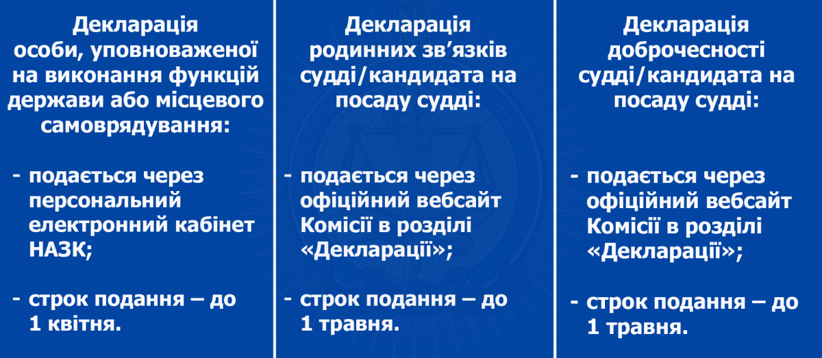 Звертаємо увагу діючих суддів і кандидатів, які перебувають у процедурах добору або конкурсів на посаду судді, на щорічний обов’язок подання декларацій особи, уповноваженої на виконання функцій держави або місцевого самоврядування, а також родинних зв’язків та доброчесності.