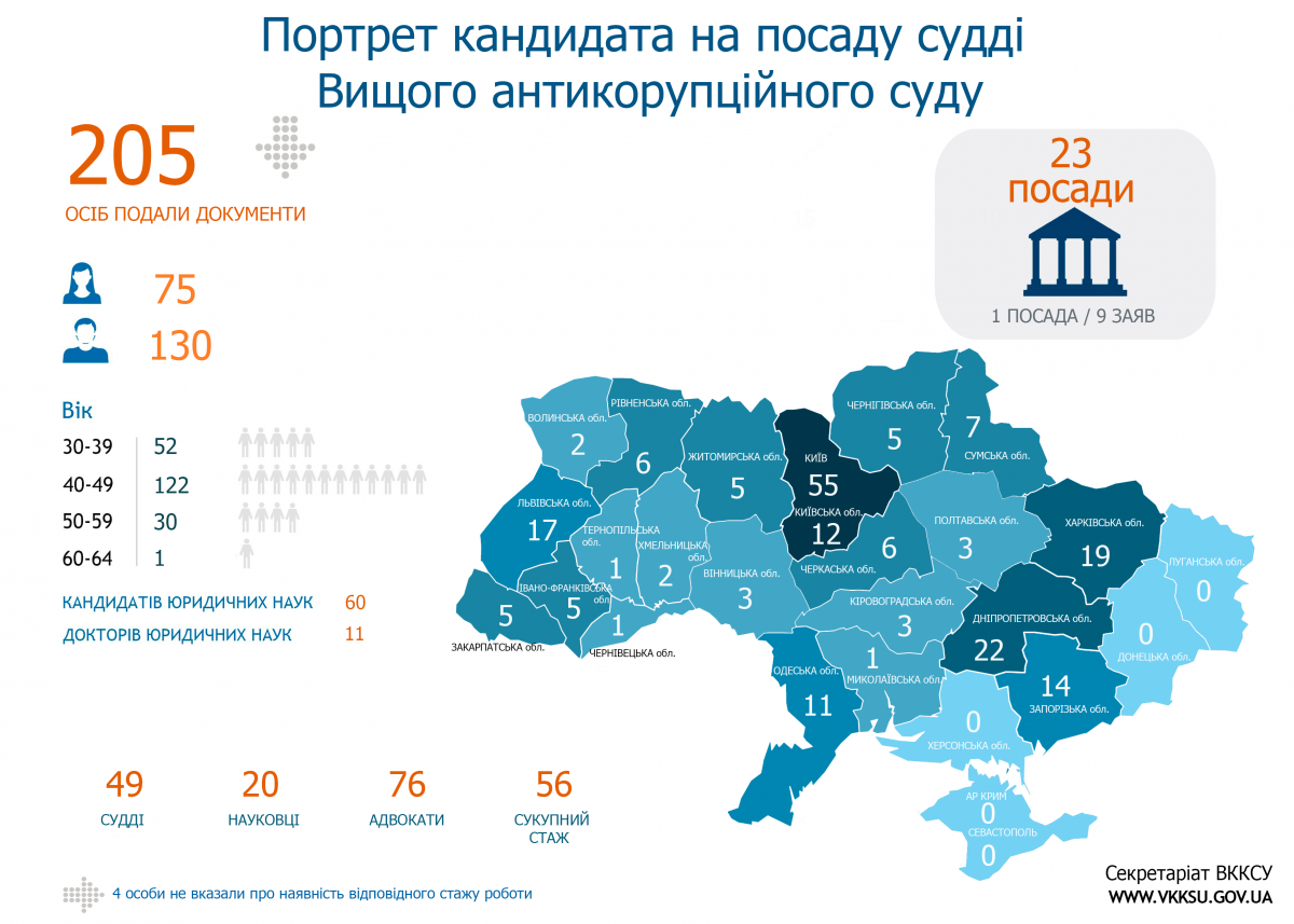 З 7 липня до 6 серпня 2025 року Вища кваліфікаційна комісія суддів України отримала документи від 205 осіб, які  виявили намір взяти участь у конкурсі на 23 вакантні посади судді Вищого антикорупційного суду (оголошений 3 червня 2025 року).