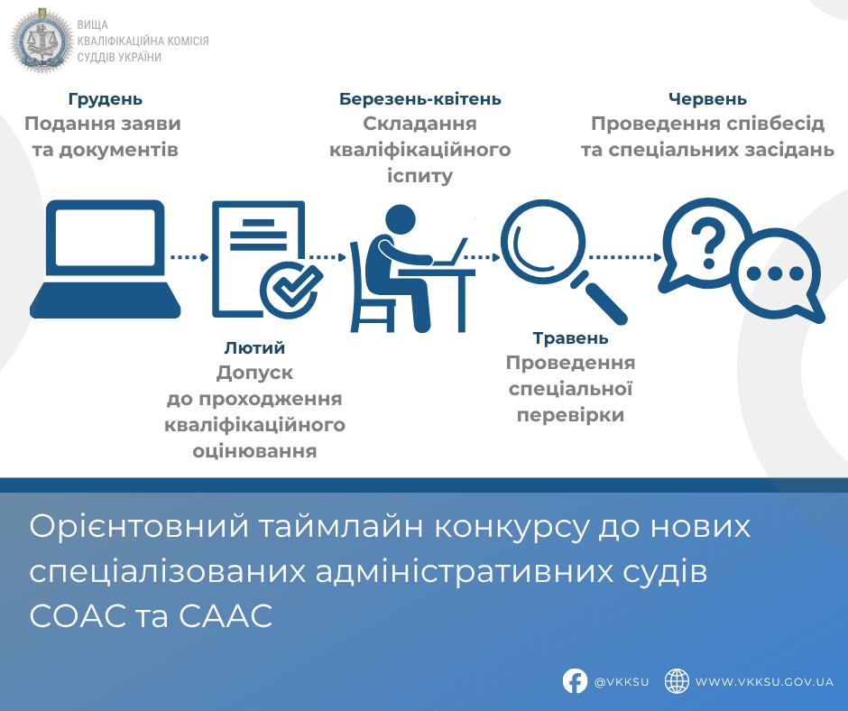 Вища кваліфікаційна комісія суддів України оголосила конкурс на зайняття посад у новоутворених спеціалізованих адміністративних судах. Загалом буде відібрано 27 суддів, з яких 17 працюватимуть у Спеціалізованому окружному адміністративному суді, а ще 10 – у Спеціалізованому апеляційному адміністративному суді.